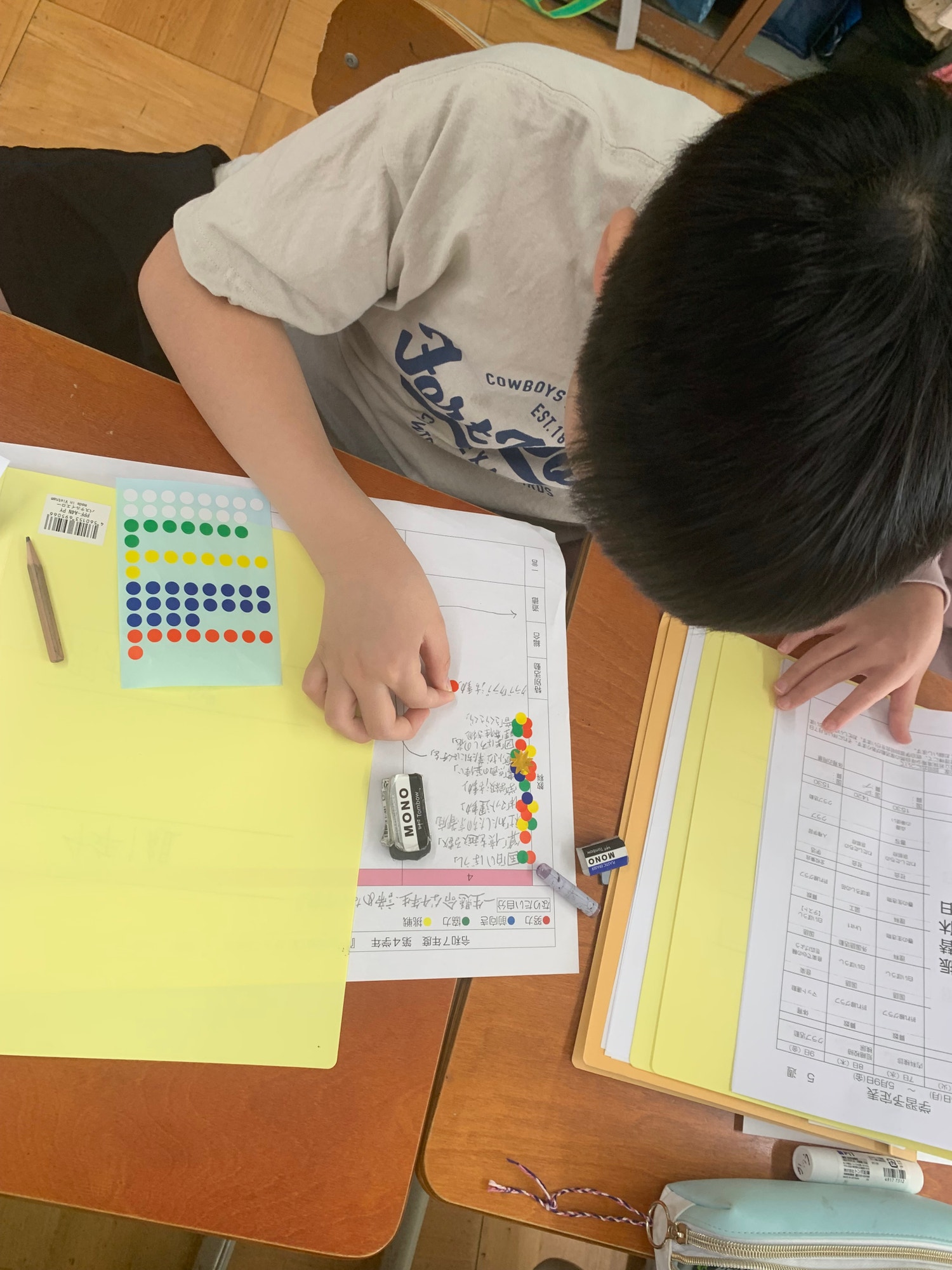 音楽で担当の先生にすごく怒られて、気持ちが整理できなかったらしい。だけど、友だちの励ましがあり、気持ちを切り替え、自分なりに前向きにできたことを振り返ったと言ってくれました。それは3年生の時にはできなかった初めてのことだから🟦シールを貼ったと教えてくれました。