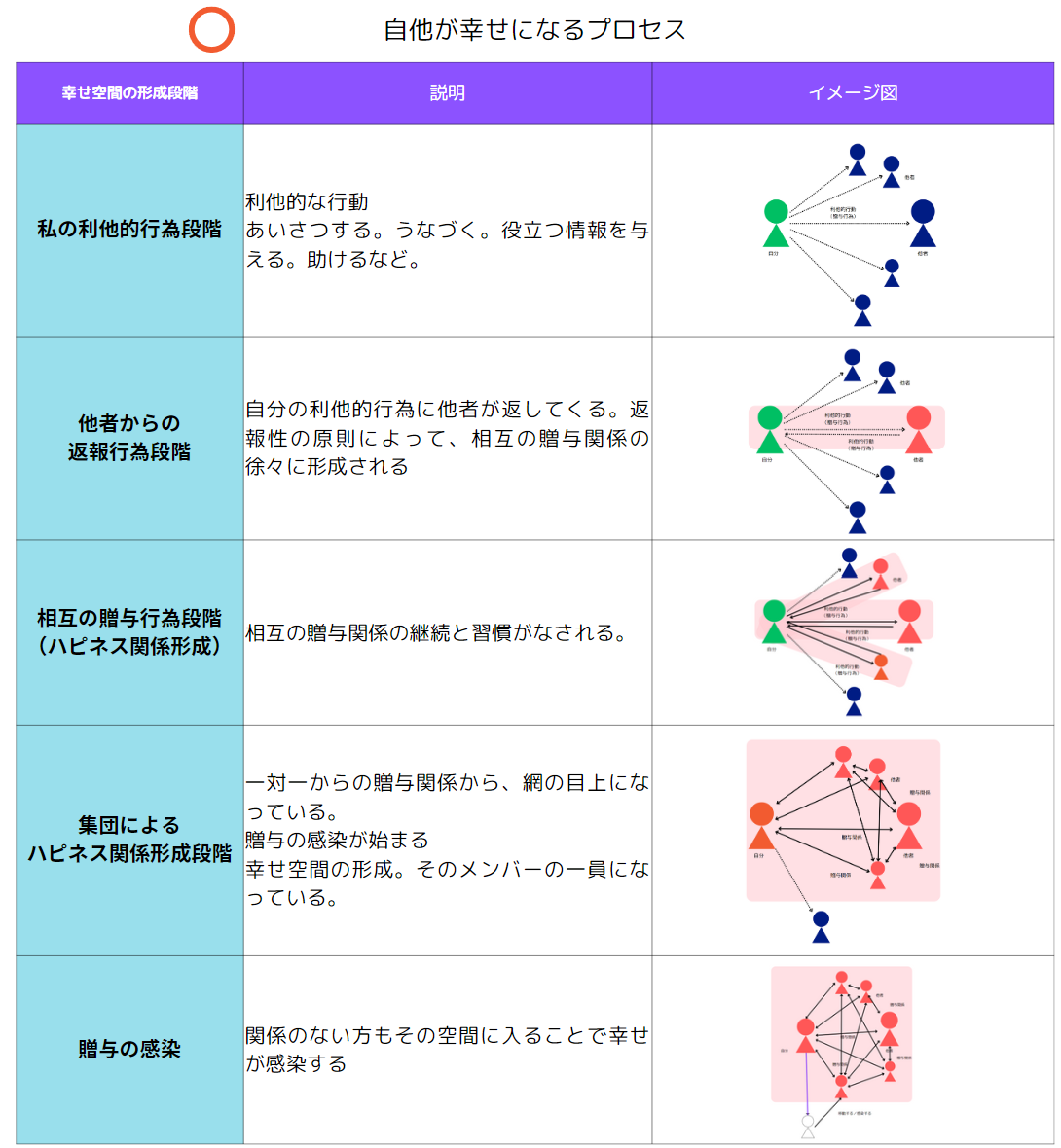 ②返本性の原理(本書に記載はありません)が働き、相手からも利他的な行為が返ってくる。(相手からの贈与行為段階)
