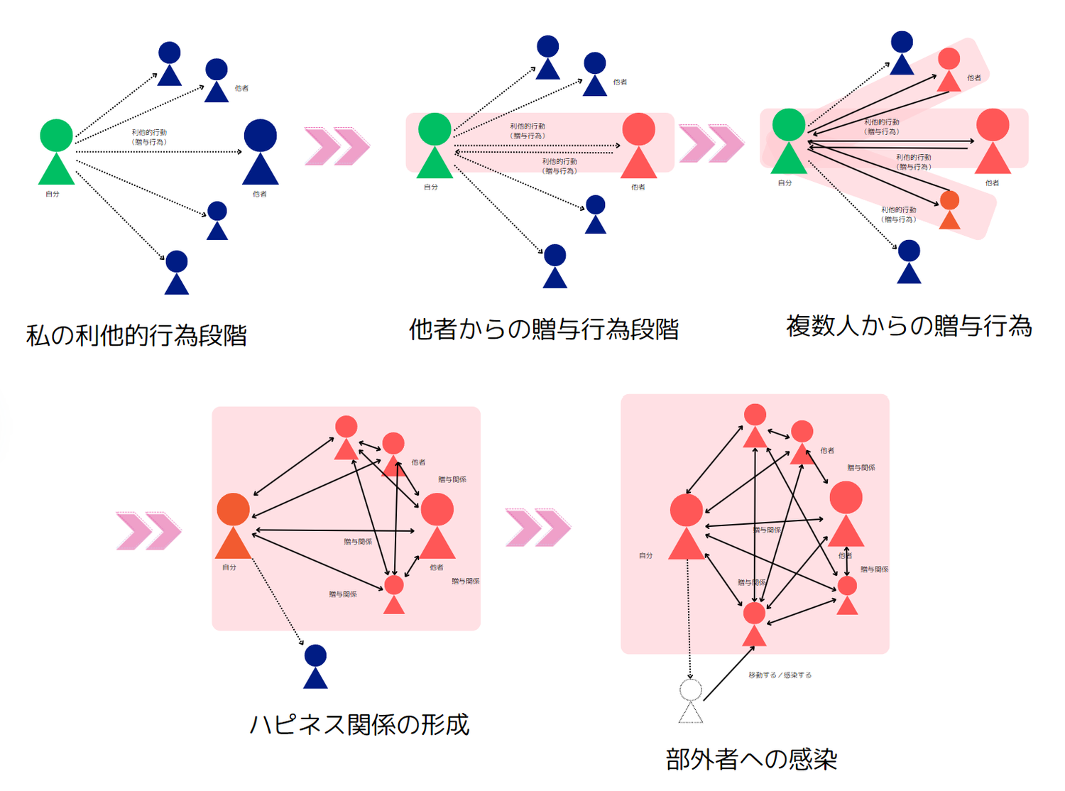 ①自分が相手に利他的な行為をする。(私の利他的行為段階)
