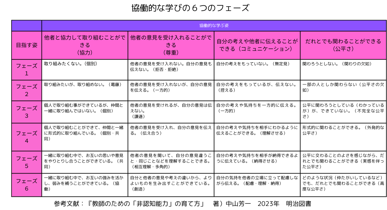 上の「協働的な学びの6つのフェーズ」について、校内研究のために作成しました。