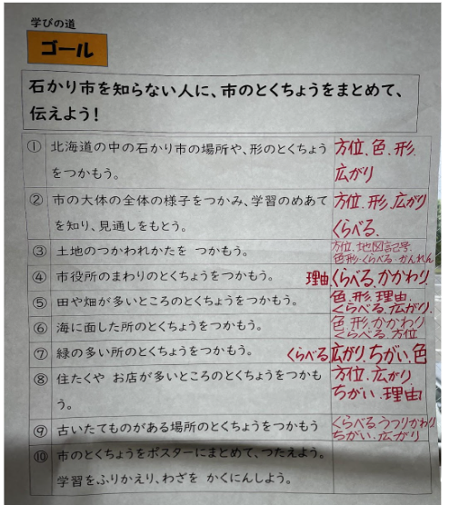 ふと教室の窓際を見ると、単元プラン(その先生は「学びの道」とされていました。)が掲示されており、各時間においてどのような社会科の見方・考え方が働いていたのかが、わかりやすく示されていました。
